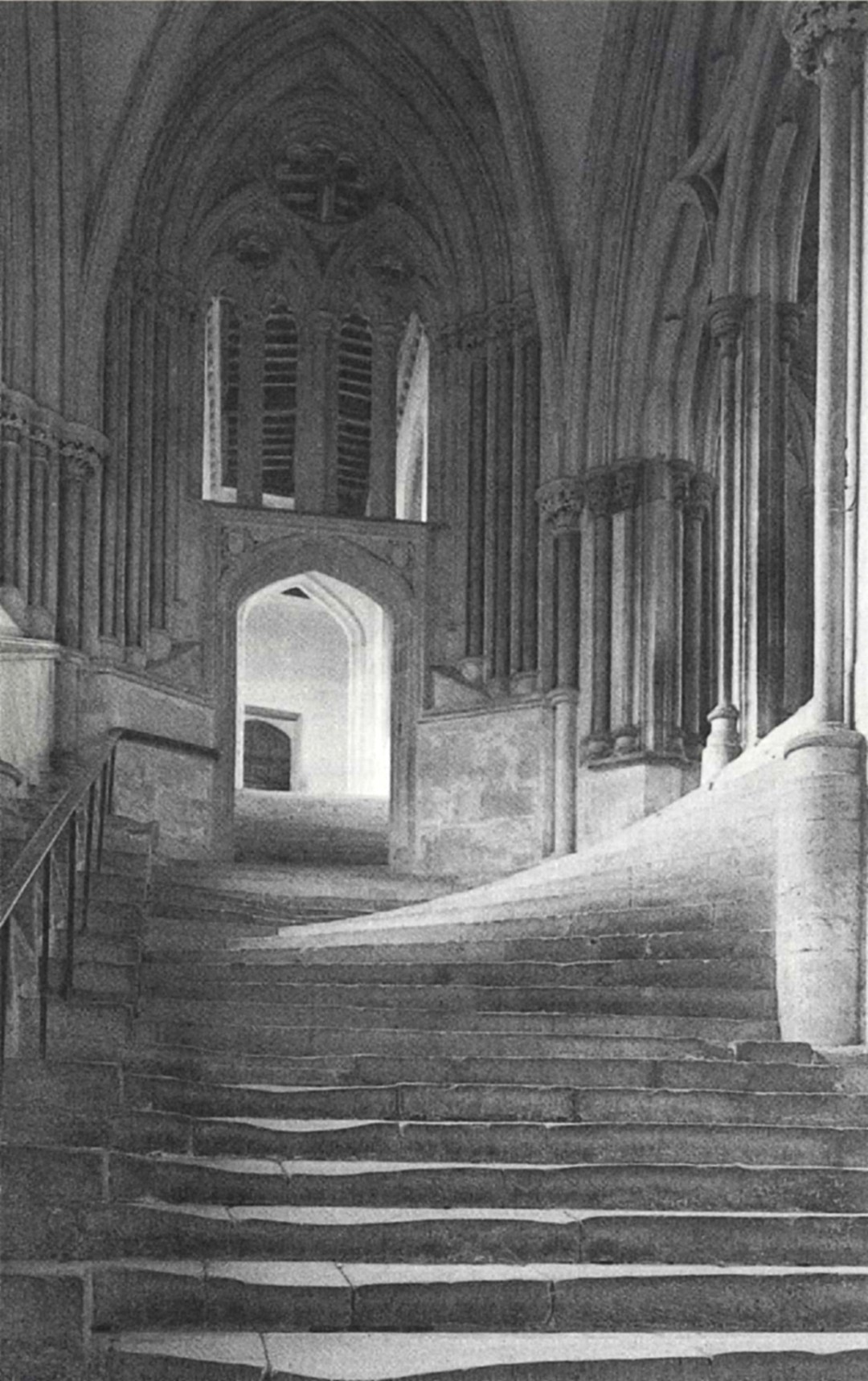 Left: Well cathedral, Somerset. The Chain Gate Stair from the north transept, 1290 – 1460. (1)