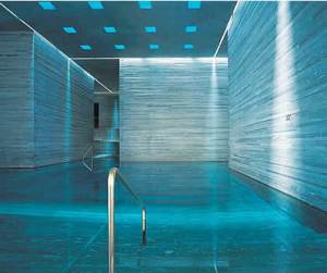 The organic staircase in the glass shop built for V.C. Morris guides you through the building. In the Therme Vals of Zumthor you are not guided and free to explore the different baths and sauna’s. There is not one defined route, like in the glass shop, but many. For example, from the central bath (see image below) four staircases lead you out of the water to explore the rest of the bathhouse.