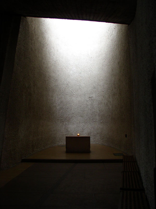 The Chapel of Notre-Dame-du-Haut, one of Le Corbusier’s later works, is in big contrast with his earlier buildings with daylight flooded rooms. He created a church interior which had “the emotional appeal that is based on the shadowed dimness of indirect lighting, in which form is only vaguely revealed.” (2)