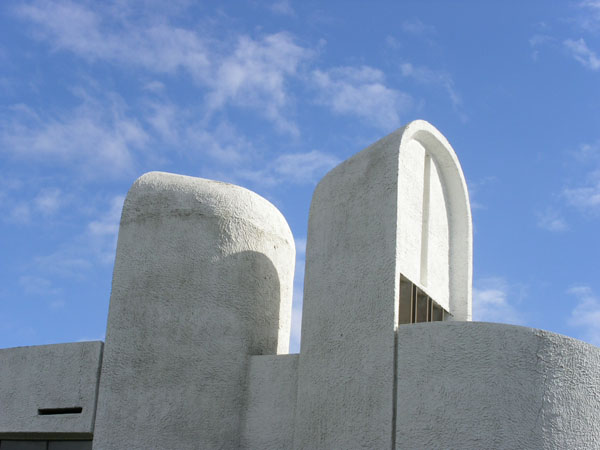At the time of its completion in 1954, the Chapel at Ronchamp shocked the critics who went to see it. Pevsner complained of a retreat into “irrationality”, thus betraying his prejudice that Le Corbusier’s earlier works had been somehow “rational”. (3) Le Corbusier himself wrote to the client: “I have not experienced the miracle of faith but I have often known the miracle of inexpressible space, the apotheosis of plastic emotion”. (4) Later, he wrote that he was interested in “the effect of architectural forms and the spirit of architecture in the construction of a vessel of intense concentration and meditation” and in what he called “an acoustic component in the domain of form”. In other words, he sought to evoke spiritual emotions through the play of form, space and light, and without recourse to any obvious church typology. (5)